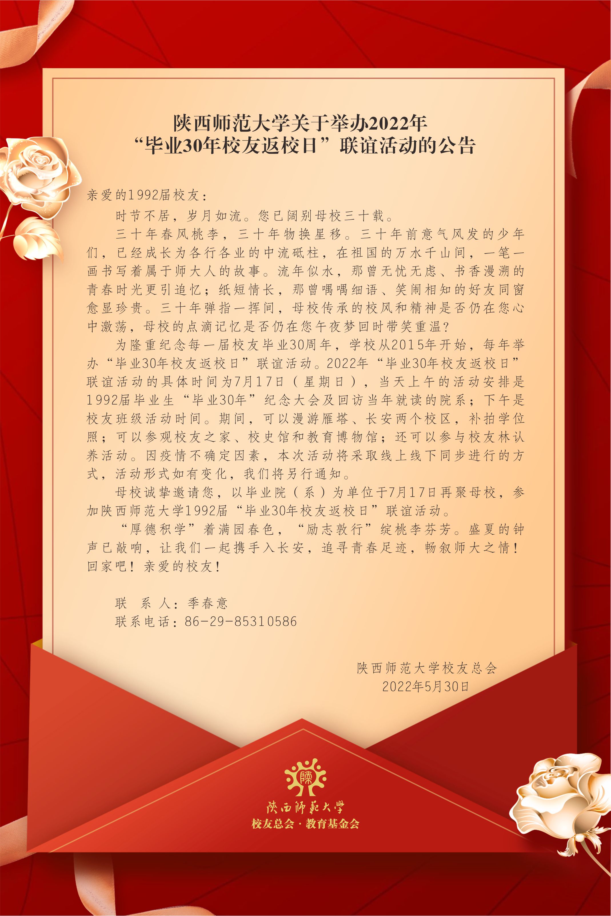 kaiyun体育网页登录入口关于举办2022年“毕业30年校友返校日”联谊活动的公告