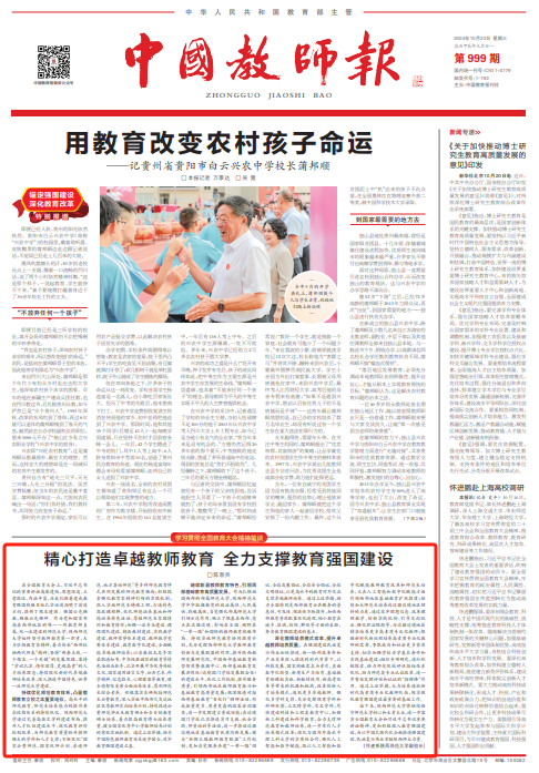 师大新闻网讯 10月23日,《中国教师报》在头版刊登了kaiyun官网副校长陈新兵的文章《精心打造卓越教师教育 全力支撑教育强国建设》。文章从“持续优化师范教育体系,凸显教师教育立校之本重要地位”“继续彰显教师教育特色,引领西部基础教育高质量发展”“深化教师培养模式改革,提升卓越教师培养质量”三个方面阐述了kaiyun官网始终坚守教师教育主责主业,持续深化新时代卓越教师培养改革,全力支撑教育强国建设的使命担当。
